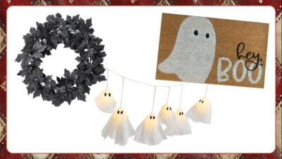 While you’ll find a few scattered pumpkins and a paper bat or two inside my home come October, I tend to keep the bulk of my Halloween decor to my front door. In my past life pre-motherhood, I liked something a bit more elegant, but now, it’s all about lighthearted ghosts and cheeky doormats. This ghost string light is on clearance and so fun to hang around your front door frame (or even inside along a fireplace mantel or your front window). IKEA’s new Halloween collection is great and super affordable, so I’d pick a black leaf wreath for a touch of cool, and then get silly on the ground with a Hey, Boo welcome mat.