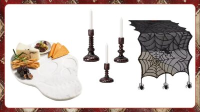Quinn knows a thing or two about leaning into a theme—her skeleton charcuterie board went super viral last year—so it’s no surprise she’d use her $100 budget on this skeleton marble board. “Cheese boards are my go-to for hosting (because no cooking required, duh),” she says. “My pick is the perfect Halloween-ready serving piece because it sets a spooky tone right away when topped with ‘fleshy’ salami and prosciutto.” To really nail the eerie vibes, she likes to layer in this lace spiderweb table runner. “Drape it over a dark cloth to create the perfect base for serving boards and appetizers,” she recommends. For a final touch, she also likes these burgundy candle holders, which can stay out through Thanksgiving and into the holiday season.