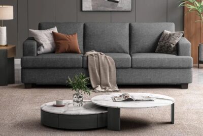 For an effortlessly styled look, place your throw blanket across one of your sofa cushions, either loosely draped or neatly folded depending on the overall look you want to achieve. This approach keeps the setup feeling cozy and approachable while adding an extra layer of texture and color to your seating area. In the image above, the gray throw falls naturally over the center cushion, softening the furniture’s lines and giving the space an inviting, lived-in feel. It’s the perfect balance between casual and curated.