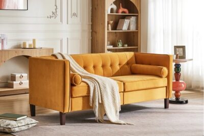 For an inviting, effortless look, simply let your throw blanket hang over the armrest so it cascades toward the floor. This easy styling method adds a touch of softness and texture, especially when paired with a cozy knit or fringed design. As shown above, the beige throw layered over the bright sofa creates a subtle contrast and relaxed, welcoming feel.