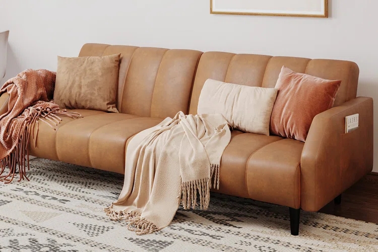 For an inviting, effortless look, simply let your throw blanket hang over the armrest so it cascades toward the floor. This easy styling method adds a touch of softness and texture, especially when paired with a cozy knit or fringed design. As shown above, the beige throw layered over the bright sofa creates a subtle contrast and relaxed, welcoming feel.